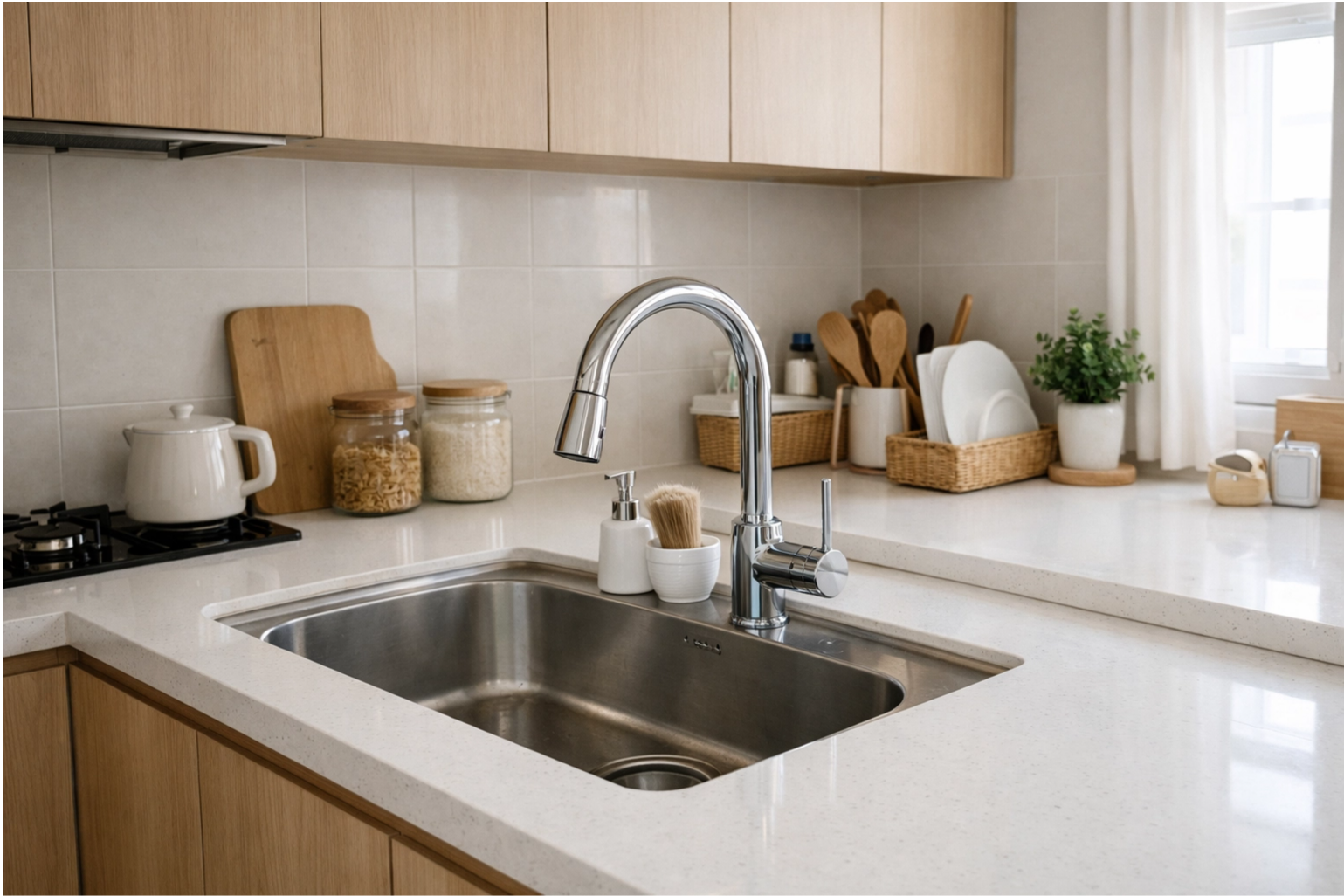 싱크대 수전 교체, 배관 연결, 환기팬·조명·콘센트 교체, 타일 부분 보수까지 주방 전반을 처리합니다.