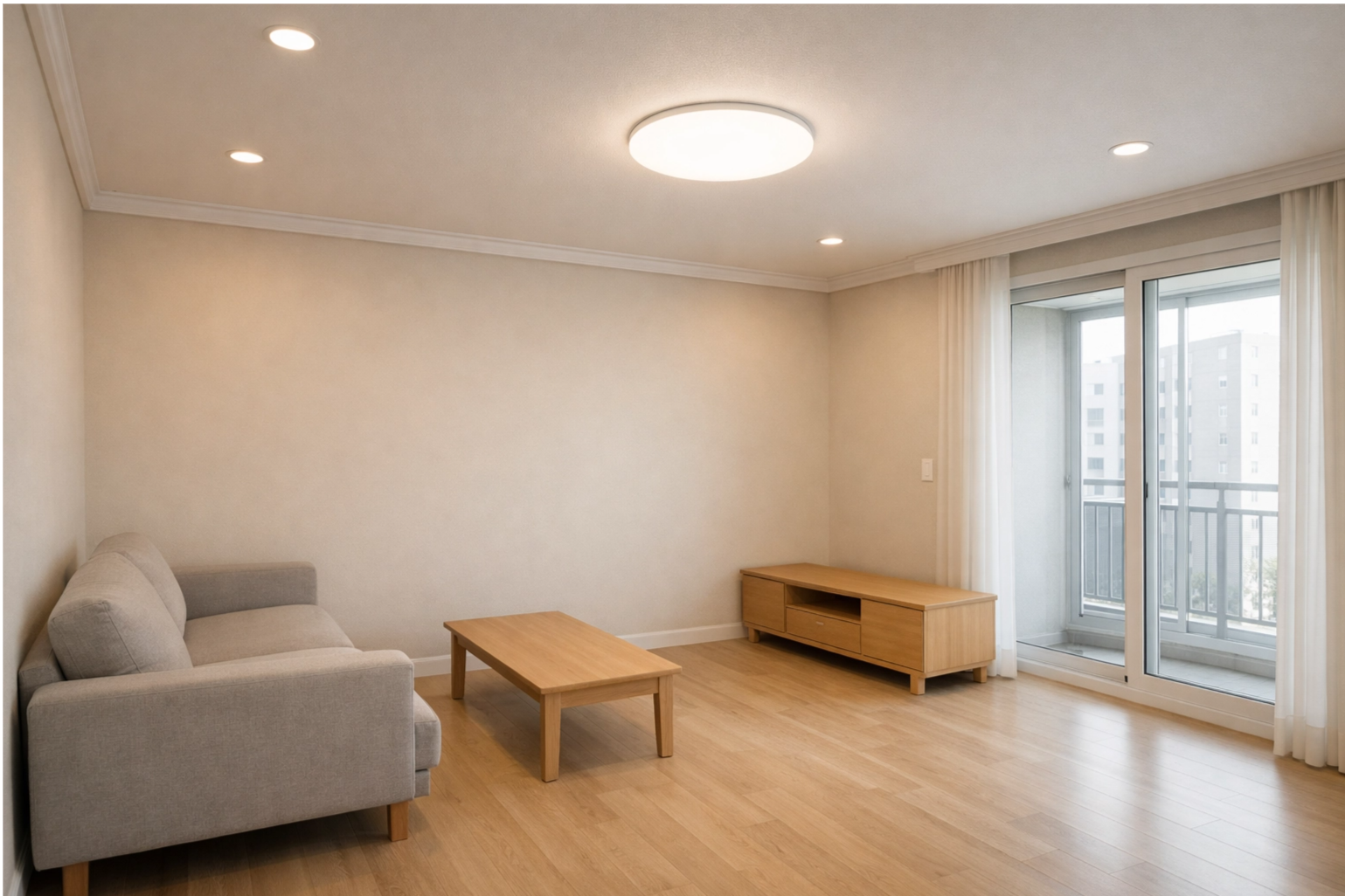 친환경 수성 페인트(KS F 3560 기준). 가정용 단상 220V 전기 자재 사용. 도배 자재는 표준 합지 기준.